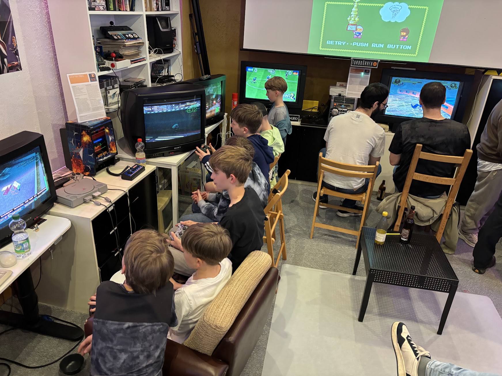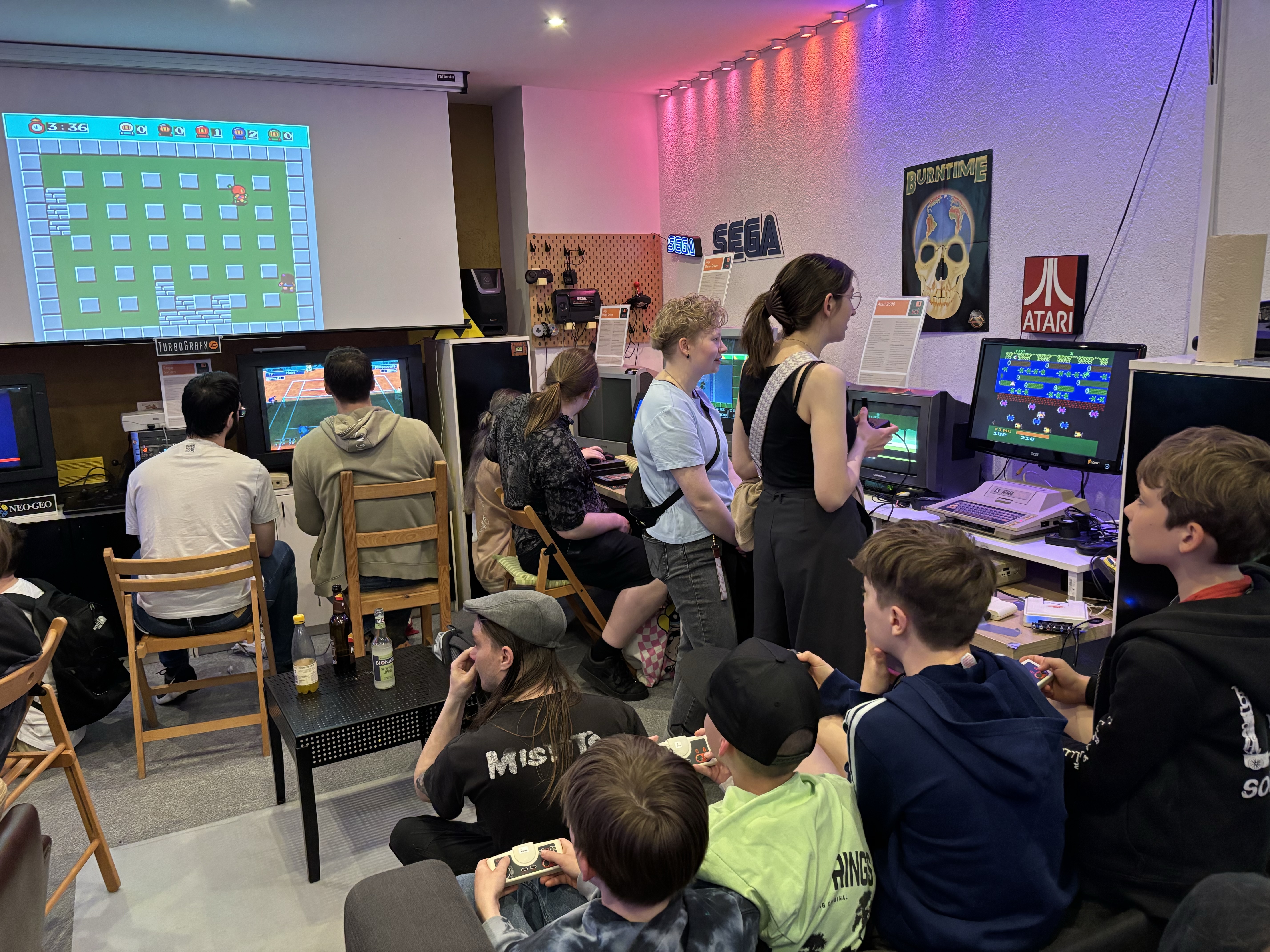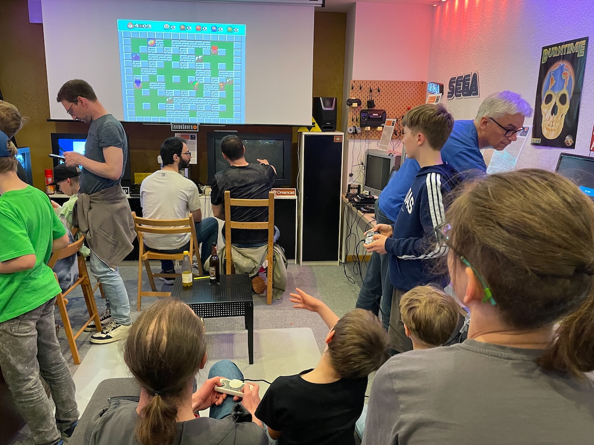 Besonders gefreut hat uns, dass selbst der Nachwuchs offensichtlich so viel Freude mit der alten Technik hatte. Viele unserer Stationen waren quasi dauerbesetzt. Ob nun beim Schlagabtausch bei Dynablaster/Bomberman mit bis zu 5(!) Spielern auf der PC-Engine, Super Mario World auf dem SNES, Super Mario Brothers auf dem NES, Tetris, Lemmings, DonkeyKong oder StreetFighter 2 auf einem selbstgebauten Automaten.